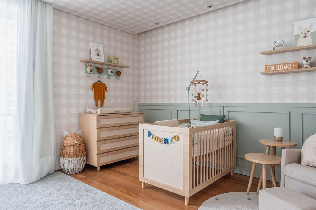 A arquiteta Camila Fleck, reconhecida por seu trabalho com celebridades e projetos de design de interiores personalizados, utilizou tons suaves, iluminação acolhedora e marcenaria sob medida para criar um espaço afetivo e seguro para o bebê.